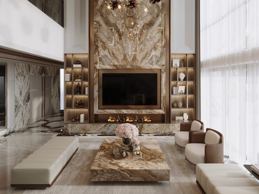 Ở các vị trí ốp, lát tường, gạch khổ lớn tạo nên cảm giác không gian được mở rộng theo cả chiều ngang lẫn chiều sâu. Việc giảm thiểu đường ron giúp bề mặt trở nên tinh giản, sang trọng và làm nổi bật trọn vẹn các đường vân đá tự nhiên. Đây là giải pháp thường được lựa chọn trong phòng khách, sảnh lớn hay các không gian mang tính trình diễn thẩm mỹ, nơi bề mặt tường đóng vai trò như một phông nền kiến trúc hoàn chỉnh.