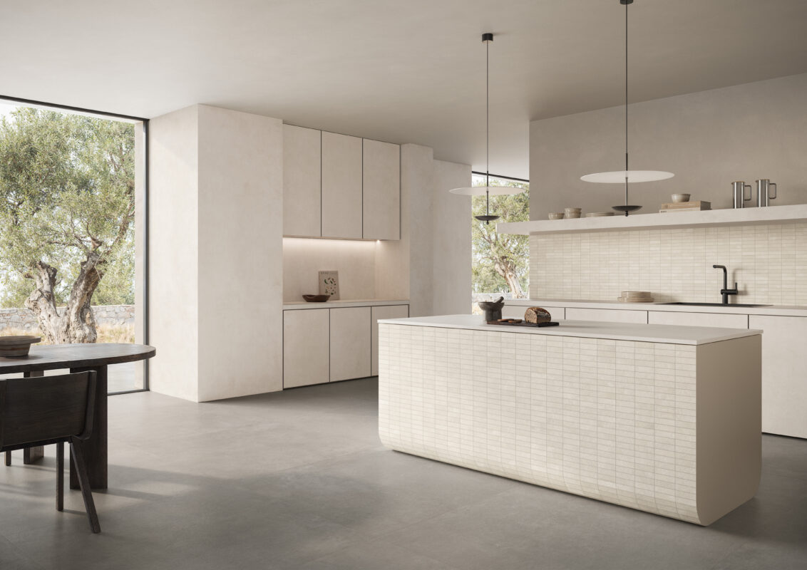 Thay vì sử dụng hai vật liệu khác nhau cho mặt bàn bếp và tường bếp, các tấm gạch porcelain khổ lớn cho phép tạo nên một bề mặt liền mạch từ mặt bếp lên backsplash.